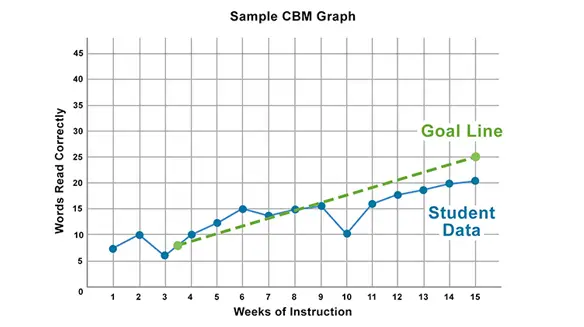 To more quickly evaluate a student’s performance over time, the educator will find it helpful to add a goal line to the student’s graph. The goal line represents the progress a student is expected to make throughout the year.